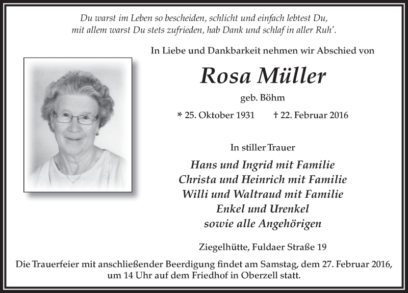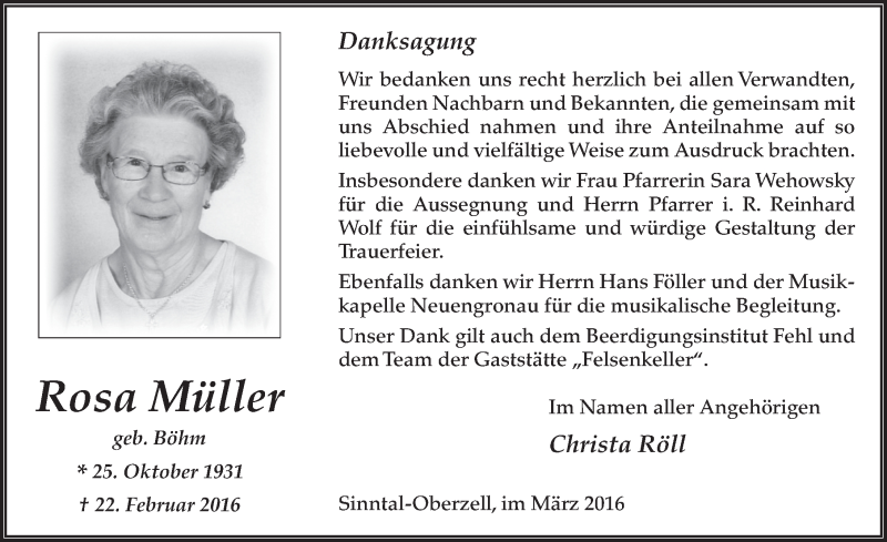 Hier finden Sie alle Traueranzeigen aus der Zeitung, die bisher für Rosa Müller erschienen sind. Weitere Traueranzeigen, die in der Zeitung erscheinen, werden hier ebenfalls aufgelistet