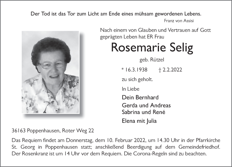 Hier finden Sie alle Traueranzeigen aus der Zeitung, die bisher für Rosemarie Selig erschienen sind. Weitere Traueranzeigen, die in der Zeitung erscheinen, werden hier ebenfalls aufgelistet