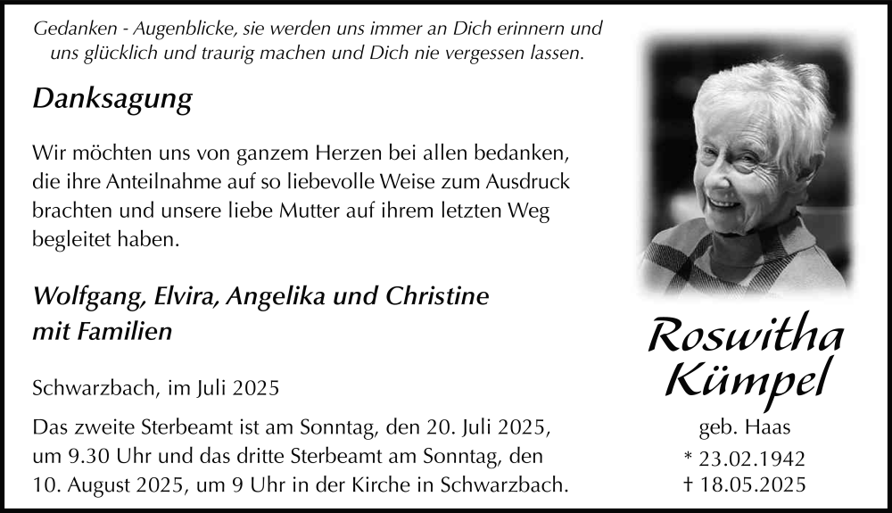 Hier finden Sie alle Traueranzeigen aus der Zeitung, die bisher für Roswitha Kümpel erschienen sind. Weitere Traueranzeigen, die in der Zeitung erscheinen, werden hier ebenfalls aufgelistet