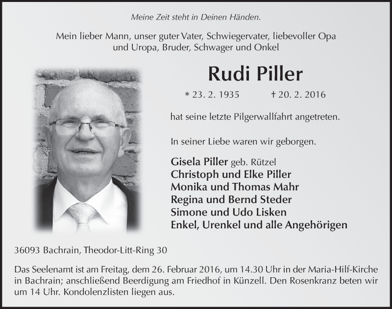 Hier finden Sie alle Traueranzeigen aus der Zeitung, die bisher für Rudi Piller erschienen sind. Weitere Traueranzeigen, die in der Zeitung erscheinen, werden hier ebenfalls aufgelistet