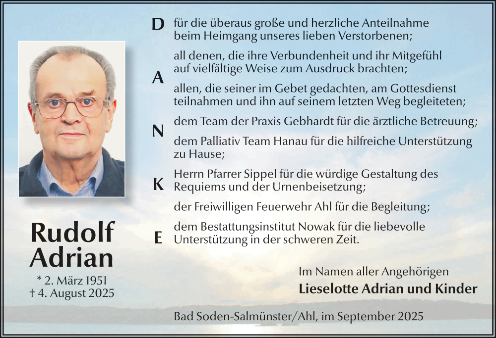 Hier finden Sie alle Traueranzeigen aus der Zeitung, die bisher für Rudolf Adrian erschienen sind. Weitere Traueranzeigen, die in der Zeitung erscheinen, werden hier ebenfalls aufgelistet