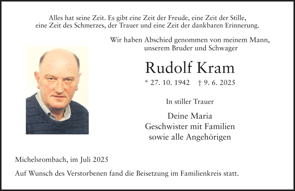 Hier finden Sie alle Traueranzeigen aus der Zeitung, die bisher für Rudolf Kram erschienen sind. Weitere Traueranzeigen, die in der Zeitung erscheinen, werden hier ebenfalls aufgelistet