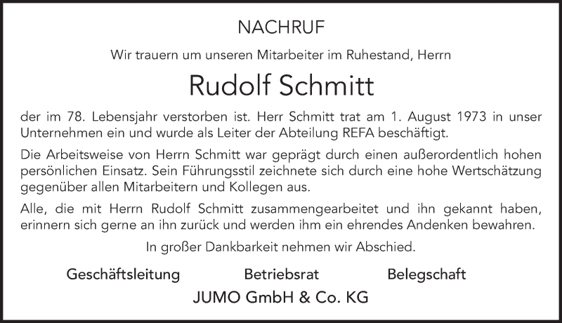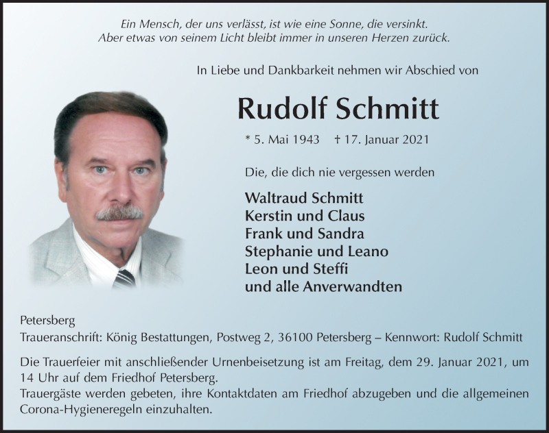 Hier finden Sie alle Traueranzeigen aus der Zeitung, die bisher für Rudolf Schmitt erschienen sind. Weitere Traueranzeigen, die in der Zeitung erscheinen, werden hier ebenfalls aufgelistet