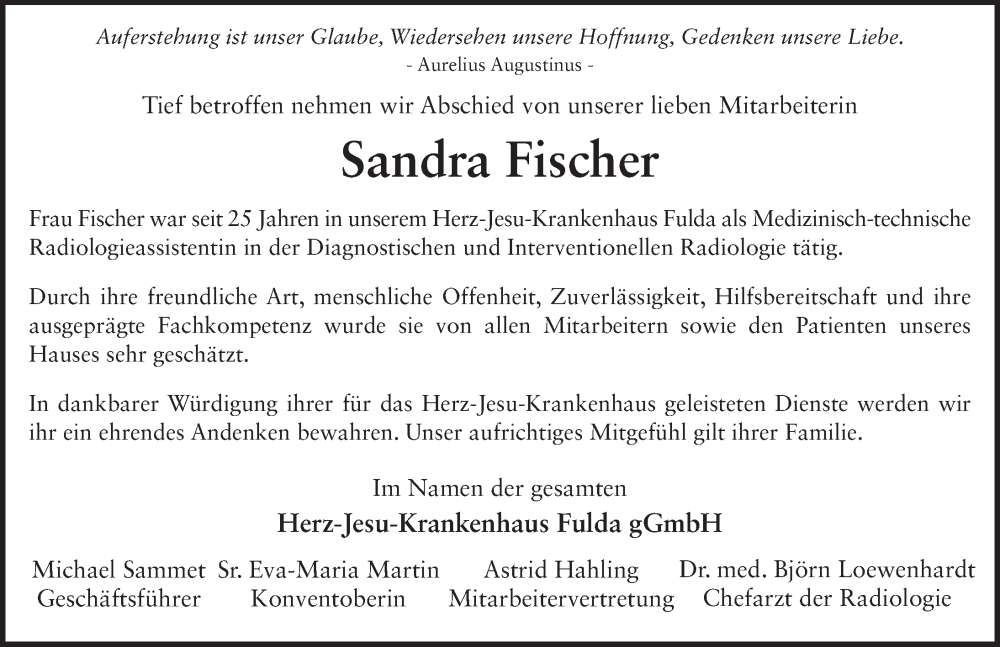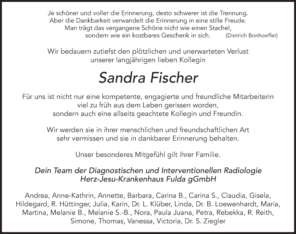 Hier finden Sie alle Traueranzeigen aus der Zeitung, die bisher für Sandra Fischer erschienen sind. Weitere Traueranzeigen, die in der Zeitung erscheinen, werden hier ebenfalls aufgelistet