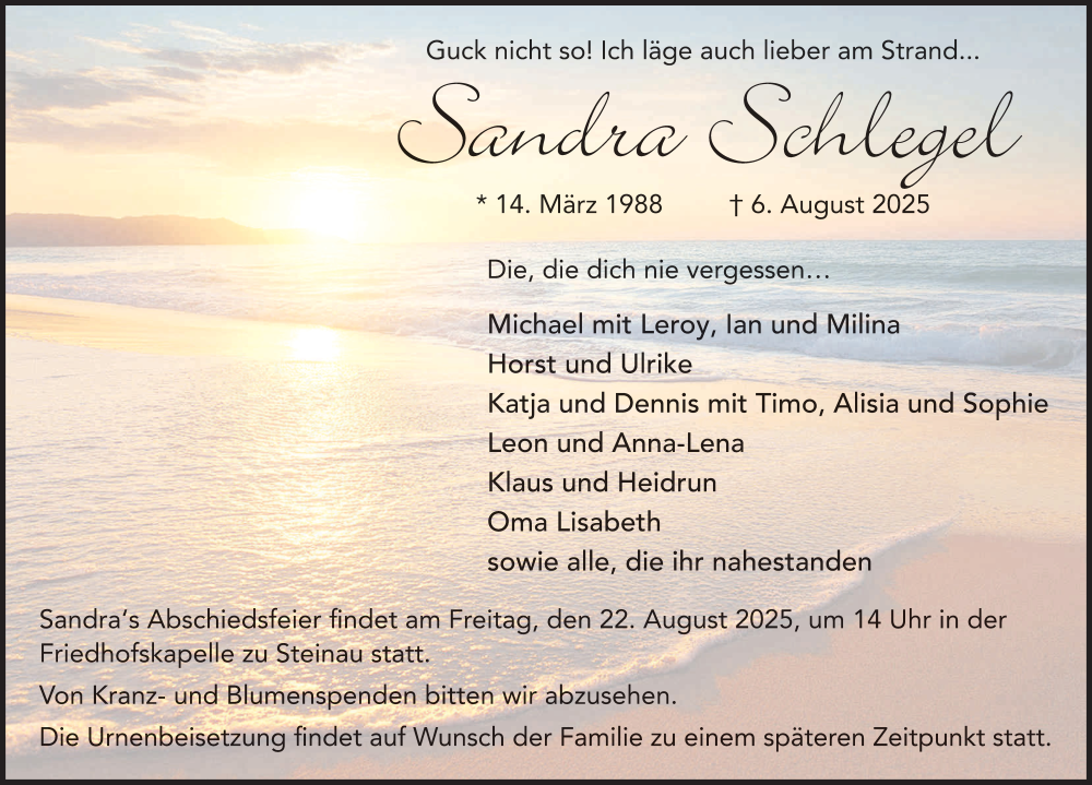 Hier finden Sie alle Traueranzeigen aus der Zeitung, die bisher für Sandra Schlegel erschienen sind. Weitere Traueranzeigen, die in der Zeitung erscheinen, werden hier ebenfalls aufgelistet