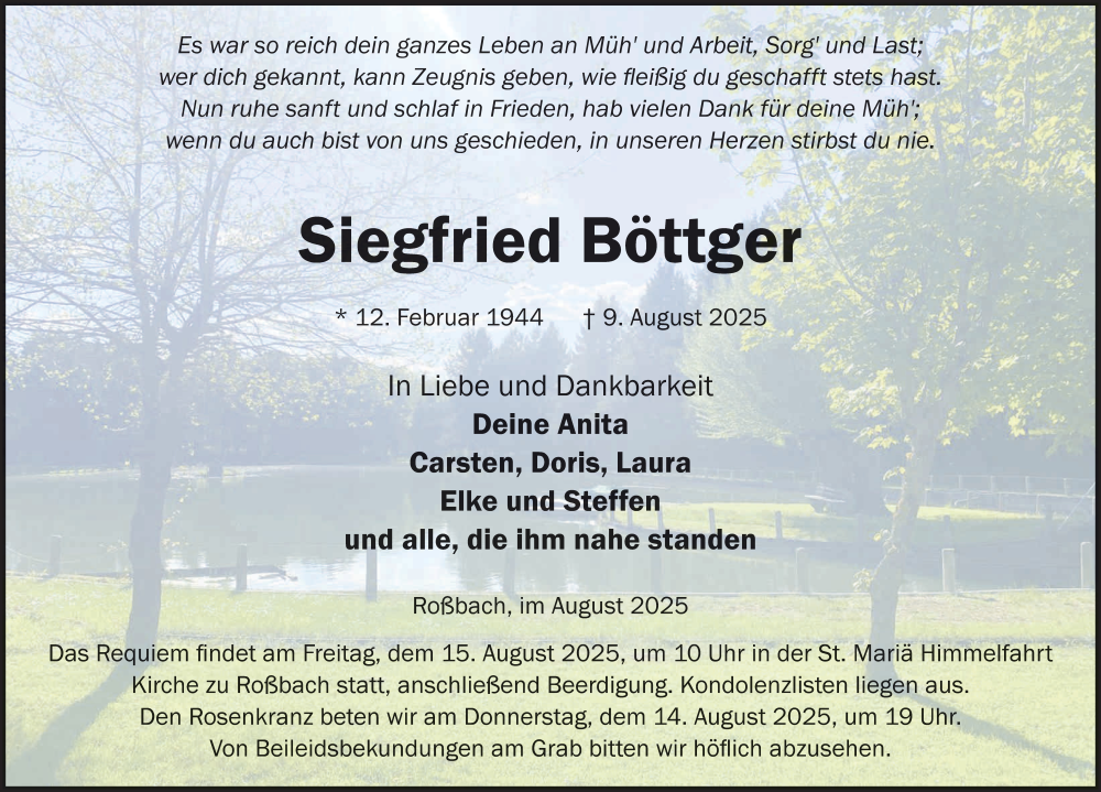 Hier finden Sie alle Traueranzeigen aus der Zeitung, die bisher für Siegfried Böttger erschienen sind. Weitere Traueranzeigen, die in der Zeitung erscheinen, werden hier ebenfalls aufgelistet