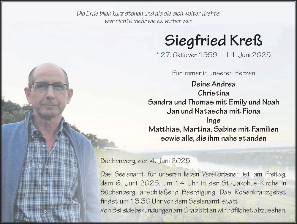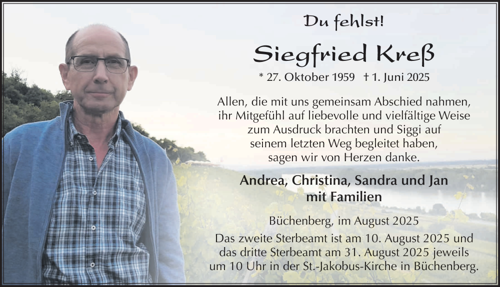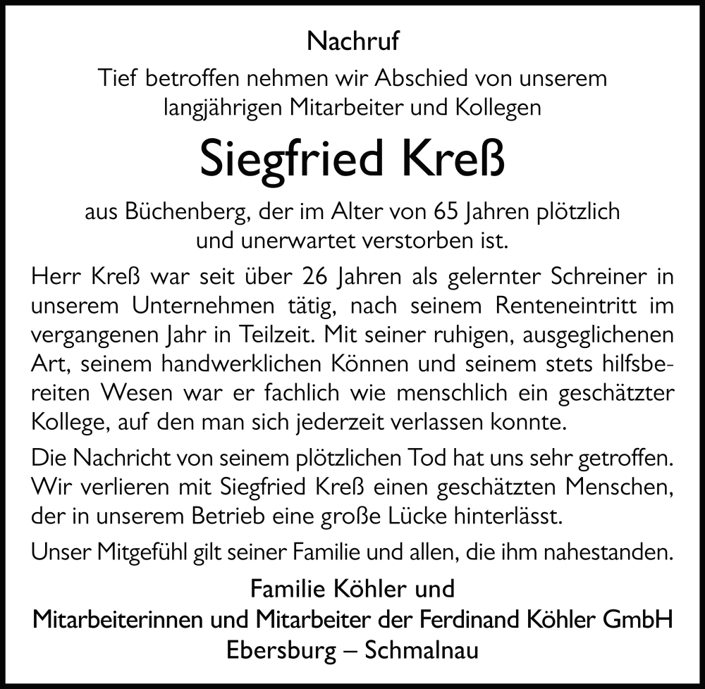 Hier finden Sie alle Traueranzeigen aus der Zeitung, die bisher für Siegfried Kreß erschienen sind. Weitere Traueranzeigen, die in der Zeitung erscheinen, werden hier ebenfalls aufgelistet