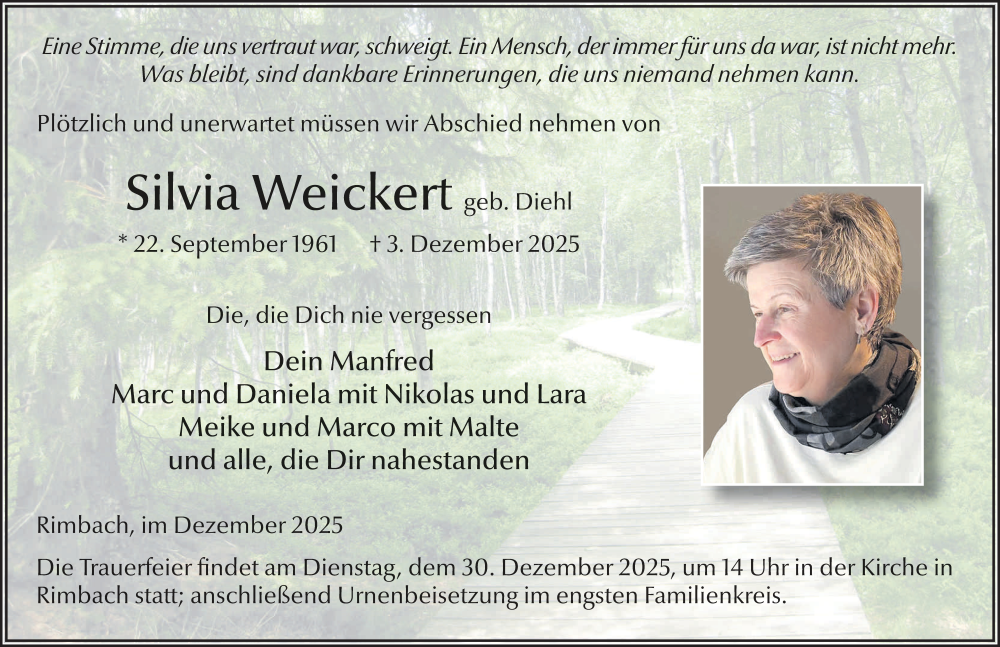 Hier finden Sie alle Traueranzeigen aus der Zeitung, die bisher für Silvia Weickert erschienen sind. Weitere Traueranzeigen, die in der Zeitung erscheinen, werden hier ebenfalls aufgelistet