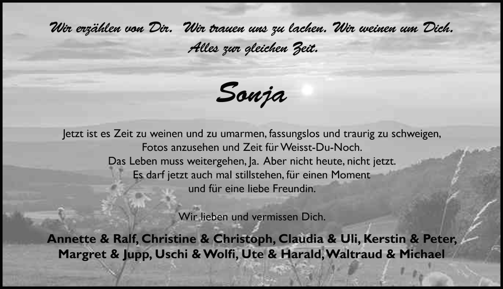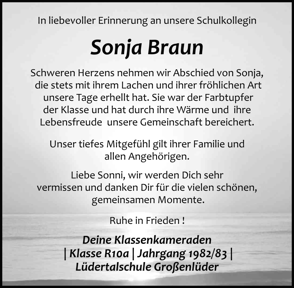 Hier finden Sie alle Traueranzeigen aus der Zeitung, die bisher für Sonja Braun erschienen sind. Weitere Traueranzeigen, die in der Zeitung erscheinen, werden hier ebenfalls aufgelistet