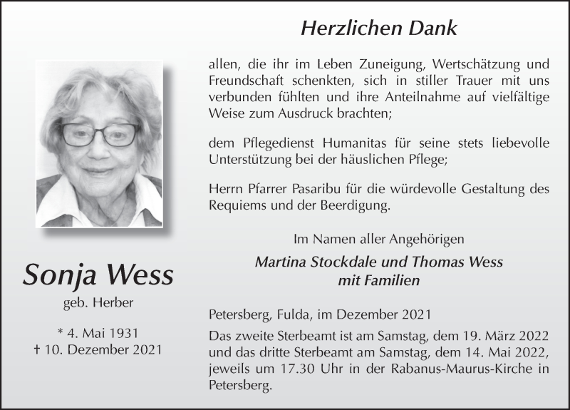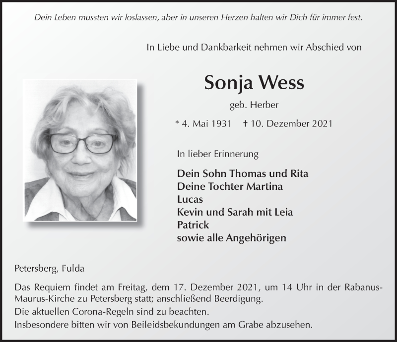 Hier finden Sie alle Traueranzeigen aus der Zeitung, die bisher für Sonja Wess erschienen sind. Weitere Traueranzeigen, die in der Zeitung erscheinen, werden hier ebenfalls aufgelistet