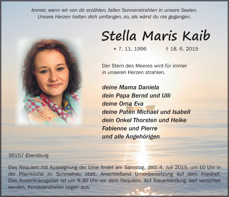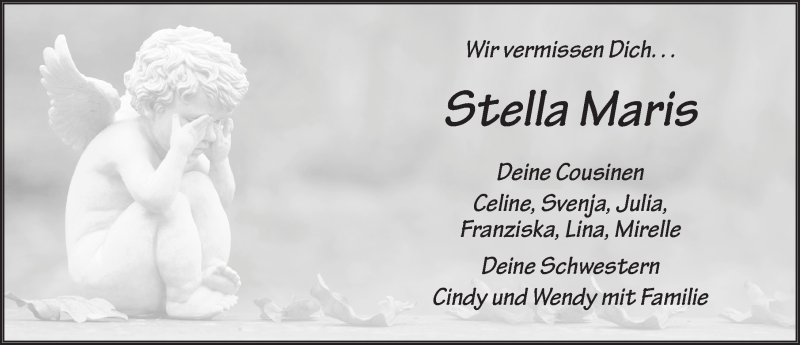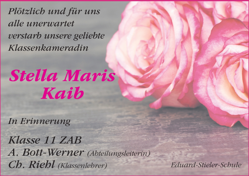 Hier finden Sie alle Traueranzeigen aus der Zeitung, die bisher für Stella Maris Kaib erschienen sind. Weitere Traueranzeigen, die in der Zeitung erscheinen, werden hier ebenfalls aufgelistet