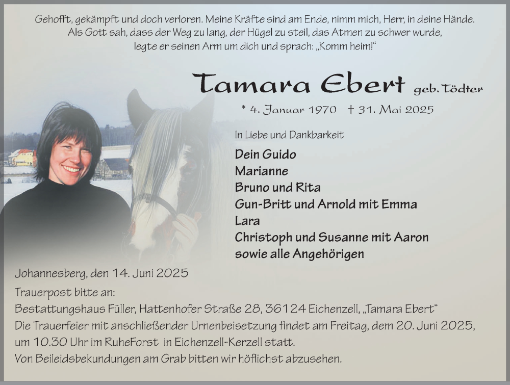 Hier finden Sie alle Traueranzeigen aus der Zeitung, die bisher für Tamara Ebert erschienen sind. Weitere Traueranzeigen, die in der Zeitung erscheinen, werden hier ebenfalls aufgelistet