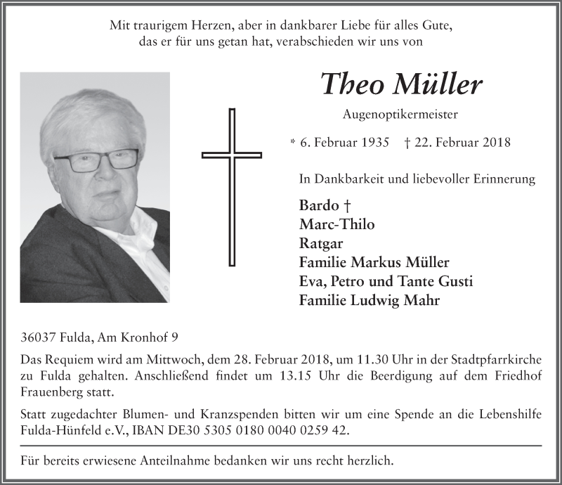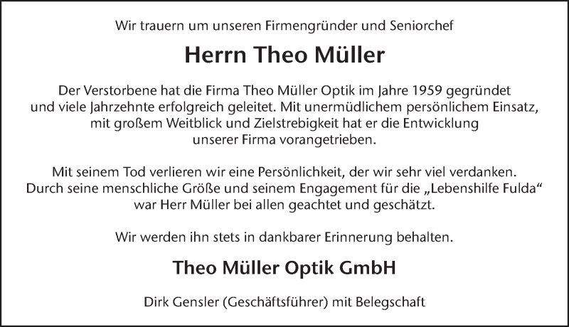 Hier finden Sie alle Traueranzeigen aus der Zeitung, die bisher für Theo Müller erschienen sind. Weitere Traueranzeigen, die in der Zeitung erscheinen, werden hier ebenfalls aufgelistet