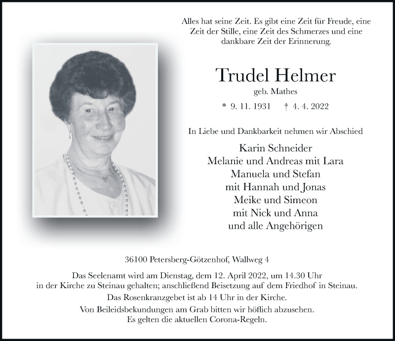 Hier finden Sie alle Traueranzeigen aus der Zeitung, die bisher für Trudel Helmer erschienen sind. Weitere Traueranzeigen, die in der Zeitung erscheinen, werden hier ebenfalls aufgelistet