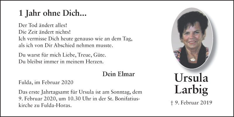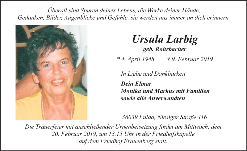 Hier finden Sie alle Traueranzeigen aus der Zeitung, die bisher für Ursula Larbig erschienen sind. Weitere Traueranzeigen, die in der Zeitung erscheinen, werden hier ebenfalls aufgelistet