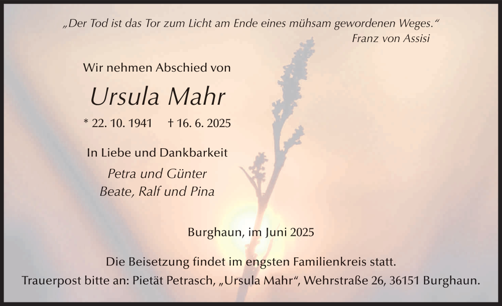 Hier finden Sie alle Traueranzeigen aus der Zeitung, die bisher für Ursula Mahr erschienen sind. Weitere Traueranzeigen, die in der Zeitung erscheinen, werden hier ebenfalls aufgelistet