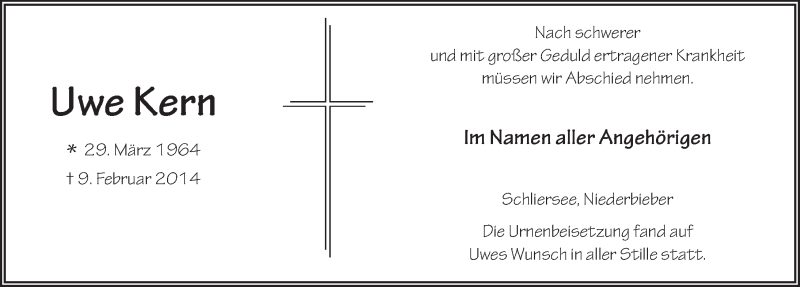 Hier finden Sie alle Traueranzeigen aus der Zeitung, die bisher für Uwe Kern erschienen sind. Weitere Traueranzeigen, die in der Zeitung erscheinen, werden hier ebenfalls aufgelistet