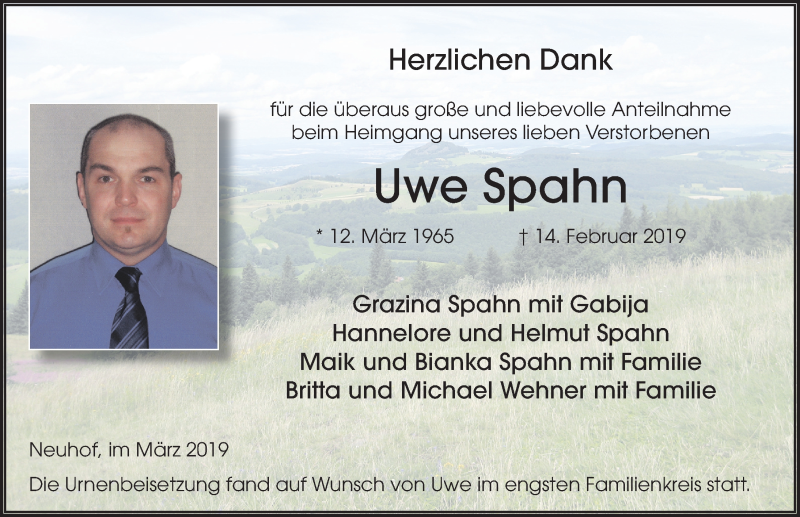 Hier finden Sie alle Traueranzeigen aus der Zeitung, die bisher für Uwe Spahn erschienen sind. Weitere Traueranzeigen, die in der Zeitung erscheinen, werden hier ebenfalls aufgelistet