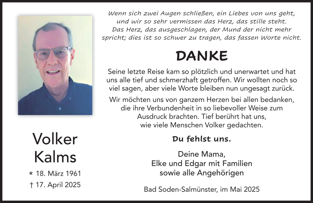 Hier finden Sie alle Traueranzeigen aus der Zeitung, die bisher für Volker Kalms erschienen sind. Weitere Traueranzeigen, die in der Zeitung erscheinen, werden hier ebenfalls aufgelistet
