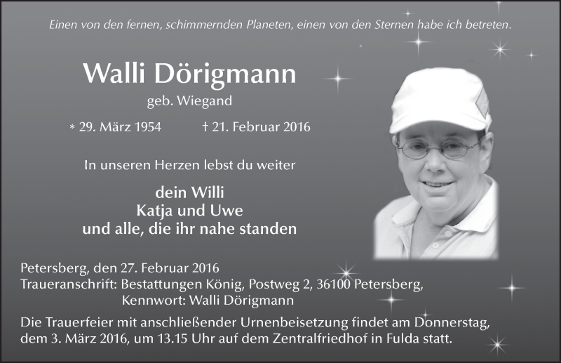 Hier finden Sie alle Traueranzeigen aus der Zeitung, die bisher für Walli Dörigmann erschienen sind. Weitere Traueranzeigen, die in der Zeitung erscheinen, werden hier ebenfalls aufgelistet