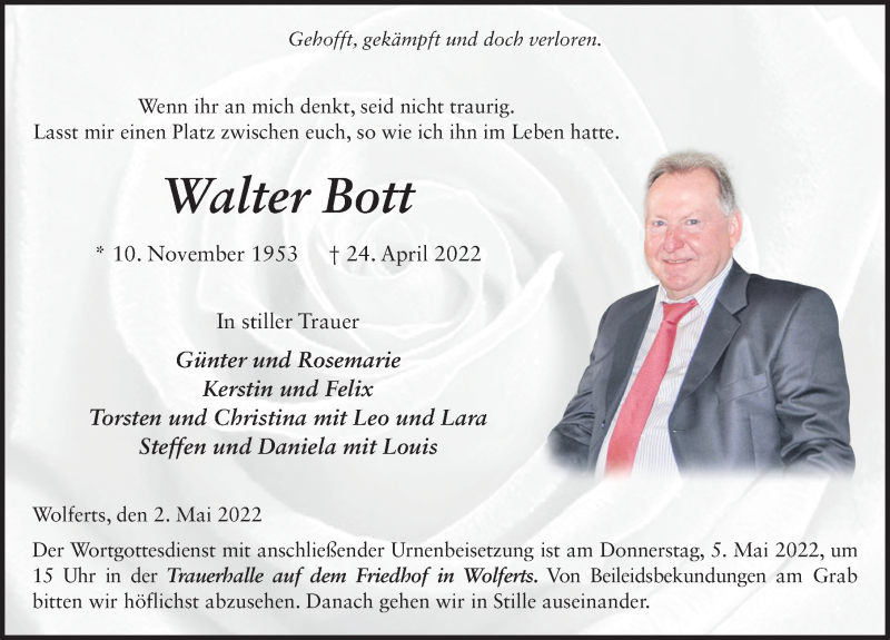 Hier finden Sie alle Traueranzeigen aus der Zeitung, die bisher für Walter Bott erschienen sind. Weitere Traueranzeigen, die in der Zeitung erscheinen, werden hier ebenfalls aufgelistet