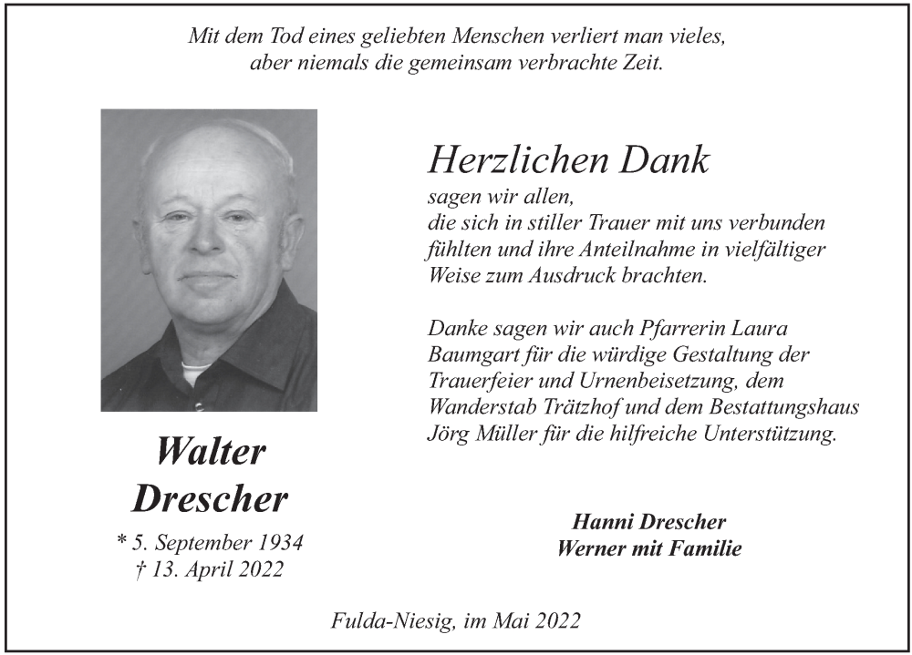 Hier finden Sie alle Traueranzeigen aus der Zeitung, die bisher für Walter Drescher erschienen sind. Weitere Traueranzeigen, die in der Zeitung erscheinen, werden hier ebenfalls aufgelistet