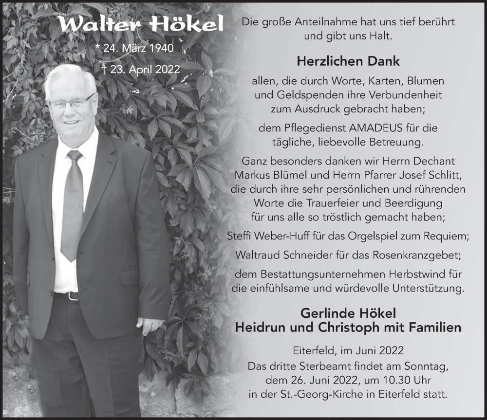 Hier finden Sie alle Traueranzeigen aus der Zeitung, die bisher für Walter Hökel erschienen sind. Weitere Traueranzeigen, die in der Zeitung erscheinen, werden hier ebenfalls aufgelistet