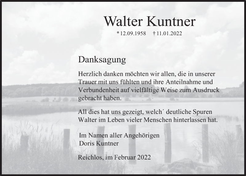 Hier finden Sie alle Traueranzeigen aus der Zeitung, die bisher für Walter Kuntner erschienen sind. Weitere Traueranzeigen, die in der Zeitung erscheinen, werden hier ebenfalls aufgelistet