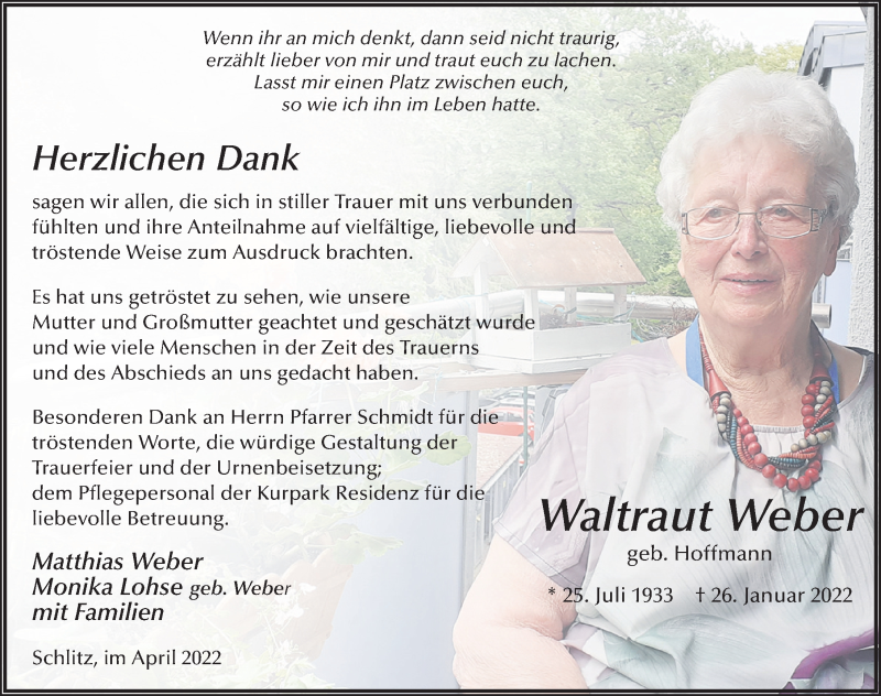 Hier finden Sie alle Traueranzeigen aus der Zeitung, die bisher für Waltraut Weber erschienen sind. Weitere Traueranzeigen, die in der Zeitung erscheinen, werden hier ebenfalls aufgelistet