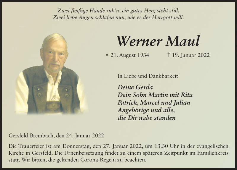 Hier finden Sie alle Traueranzeigen aus der Zeitung, die bisher für Werner Maul erschienen sind. Weitere Traueranzeigen, die in der Zeitung erscheinen, werden hier ebenfalls aufgelistet