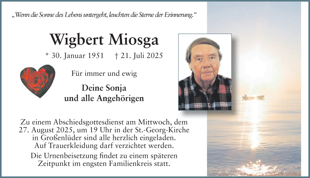 Hier finden Sie alle Traueranzeigen aus der Zeitung, die bisher für Wigbert Miosga erschienen sind. Weitere Traueranzeigen, die in der Zeitung erscheinen, werden hier ebenfalls aufgelistet