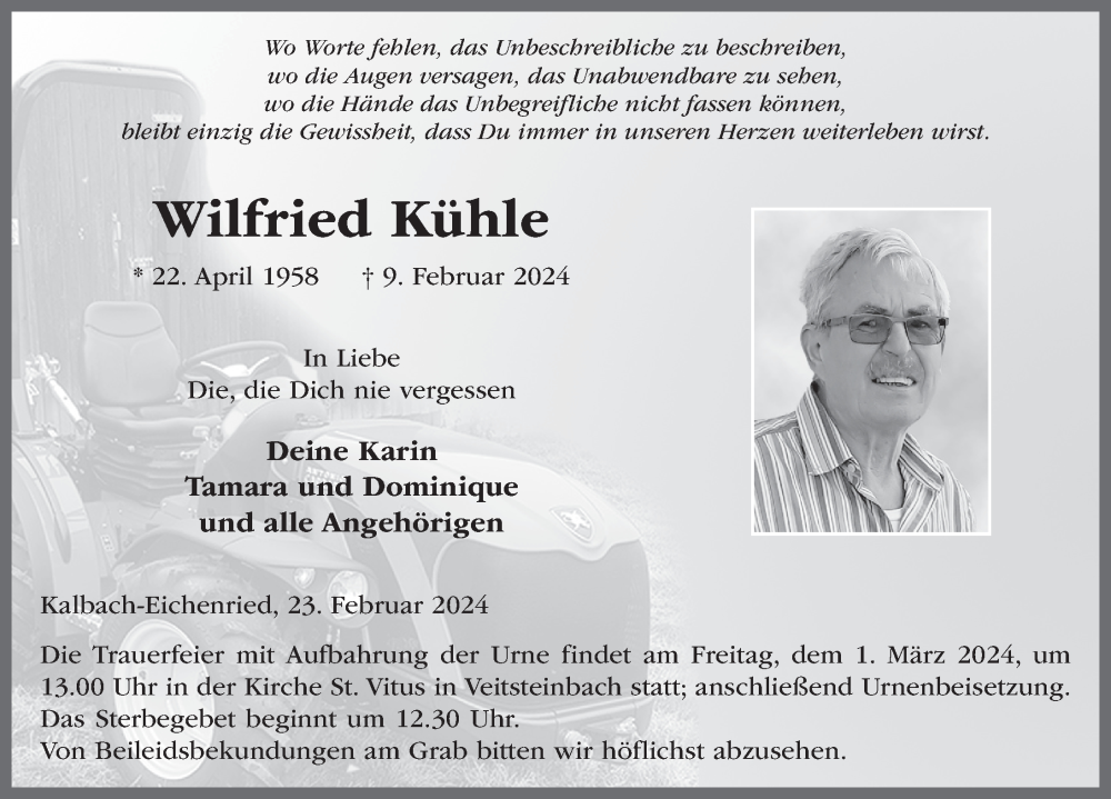 Hier finden Sie alle Traueranzeigen aus der Zeitung, die bisher für Wilfried Kühle erschienen sind. Weitere Traueranzeigen, die in der Zeitung erscheinen, werden hier ebenfalls aufgelistet