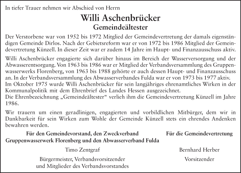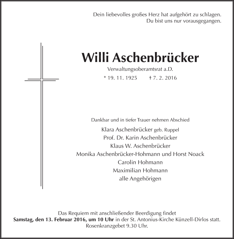 Hier finden Sie alle Traueranzeigen aus der Zeitung, die bisher für Willi Aschenbrücker erschienen sind. Weitere Traueranzeigen, die in der Zeitung erscheinen, werden hier ebenfalls aufgelistet