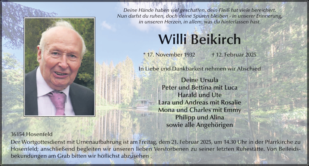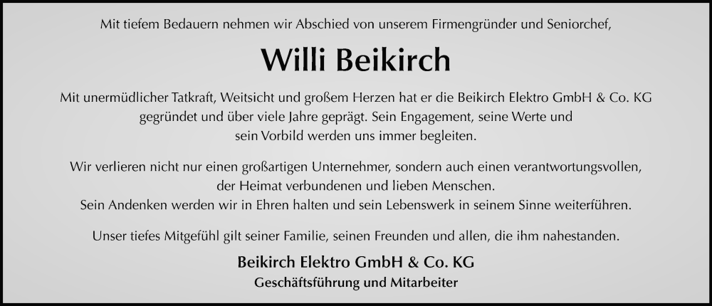 Hier finden Sie alle Traueranzeigen aus der Zeitung, die bisher für Willi Beikirch erschienen sind. Weitere Traueranzeigen, die in der Zeitung erscheinen, werden hier ebenfalls aufgelistet