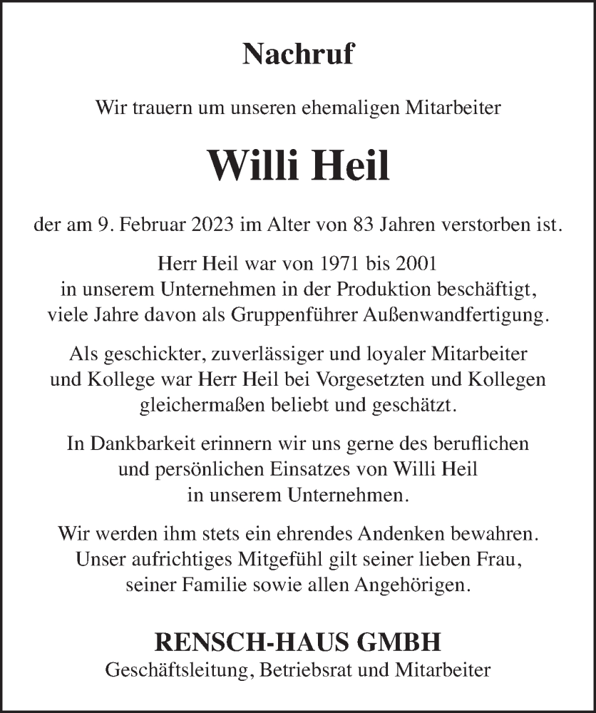 Hier finden Sie alle Traueranzeigen aus der Zeitung, die bisher für Willi Heil erschienen sind. Weitere Traueranzeigen, die in der Zeitung erscheinen, werden hier ebenfalls aufgelistet