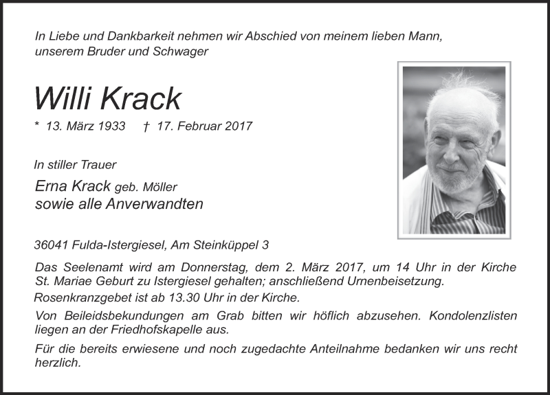 Hier finden Sie alle Traueranzeigen aus der Zeitung, die bisher für Willi Krack erschienen sind. Weitere Traueranzeigen, die in der Zeitung erscheinen, werden hier ebenfalls aufgelistet