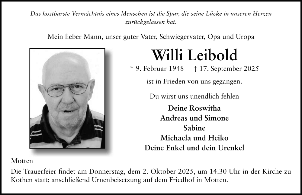 Hier finden Sie alle Traueranzeigen aus der Zeitung, die bisher für Willi Leibold erschienen sind. Weitere Traueranzeigen, die in der Zeitung erscheinen, werden hier ebenfalls aufgelistet