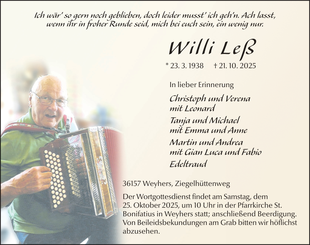 Hier finden Sie alle Traueranzeigen aus der Zeitung, die bisher für Willi Leß erschienen sind. Weitere Traueranzeigen, die in der Zeitung erscheinen, werden hier ebenfalls aufgelistet