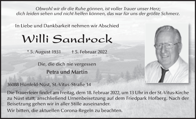 Hier finden Sie alle Traueranzeigen aus der Zeitung, die bisher für Willi Sandrock erschienen sind. Weitere Traueranzeigen, die in der Zeitung erscheinen, werden hier ebenfalls aufgelistet