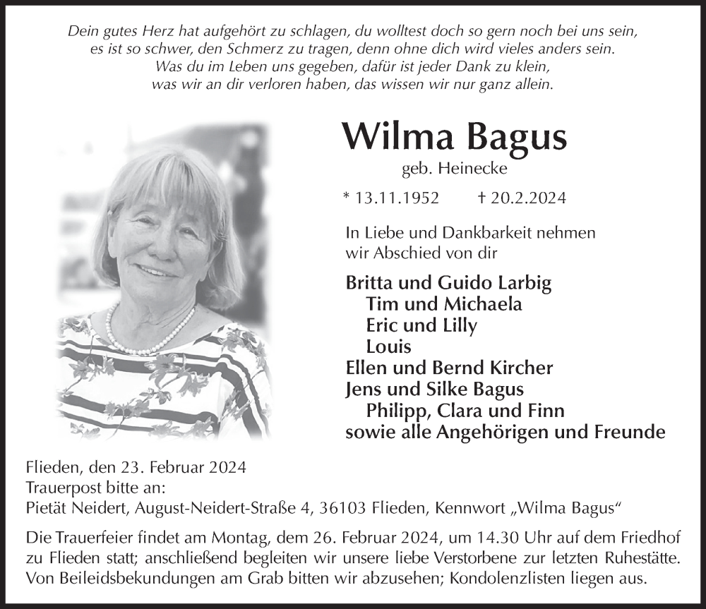 Hier finden Sie alle Traueranzeigen aus der Zeitung, die bisher für Wilma Bagus erschienen sind. Weitere Traueranzeigen, die in der Zeitung erscheinen, werden hier ebenfalls aufgelistet