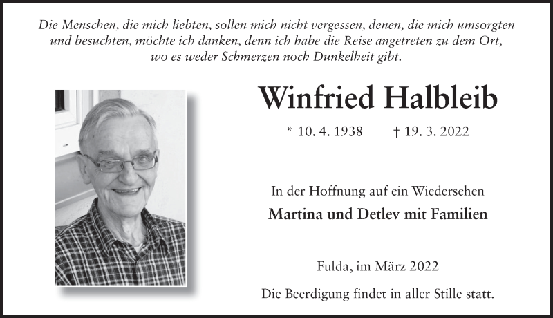 Hier finden Sie alle Traueranzeigen aus der Zeitung, die bisher für Winfried Halbleib erschienen sind. Weitere Traueranzeigen, die in der Zeitung erscheinen, werden hier ebenfalls aufgelistet