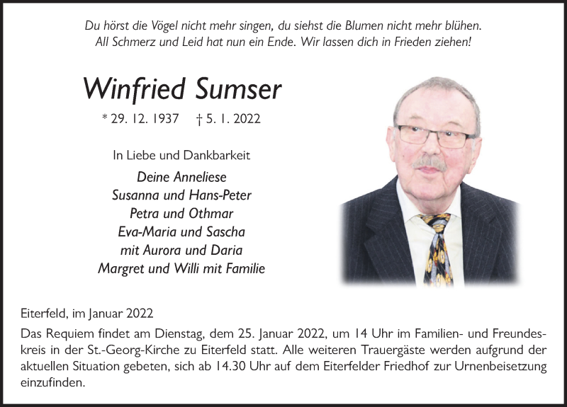 Hier finden Sie alle Traueranzeigen aus der Zeitung, die bisher für Winfried Sumser erschienen sind. Weitere Traueranzeigen, die in der Zeitung erscheinen, werden hier ebenfalls aufgelistet