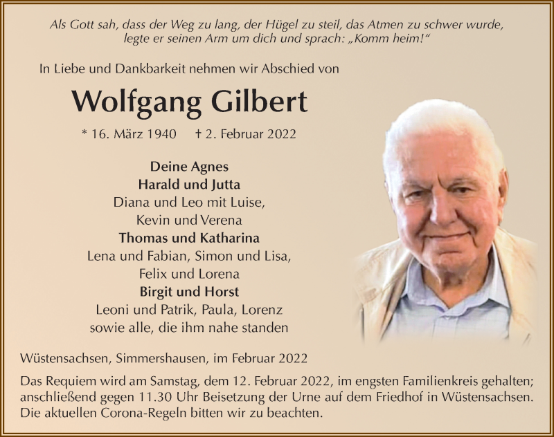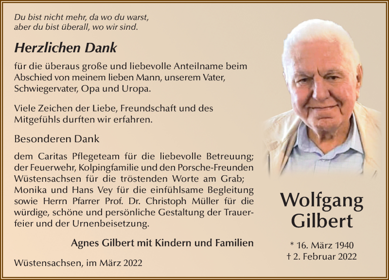 Hier finden Sie alle Traueranzeigen aus der Zeitung, die bisher für Wolfgang Gilbert erschienen sind. Weitere Traueranzeigen, die in der Zeitung erscheinen, werden hier ebenfalls aufgelistet