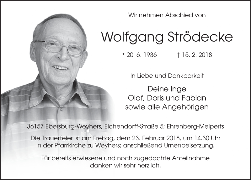 Hier finden Sie alle Traueranzeigen aus der Zeitung, die bisher für Wolfgang Strödecke erschienen sind. Weitere Traueranzeigen, die in der Zeitung erscheinen, werden hier ebenfalls aufgelistet